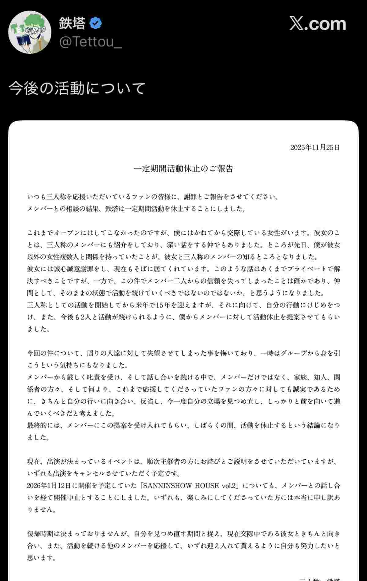 大物配信グループ三人称の鉄塔、複数人の女性と交際していたことが発覚し活動休止