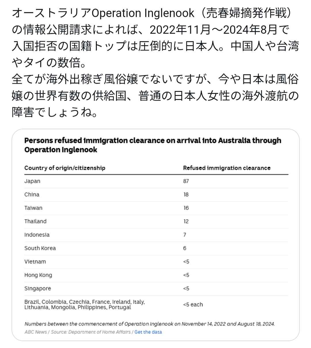 - オーストラリアOperation Inglenook(売春婦摘発作戦)の情報公開請求によれば、2022年11月~2024年8月で入国拒否の国籍トップは圧倒的に日本人。中国人や台湾やタイの数倍。