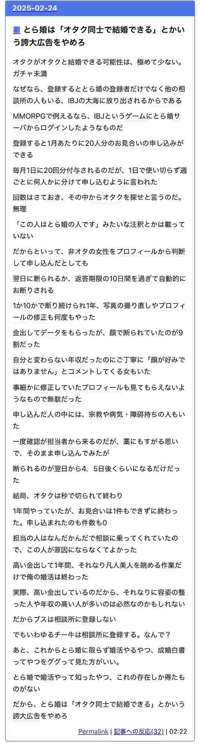加入者少ない相談所やとオマケになるんかねまあ男オタクと結婚したい女って男と比べて少なそう - 62 名前:ここからは表現の自由でイカせていただきます 投稿日時:2025/11/25(火) 14:07:31.993 ID:2tulBQcUa