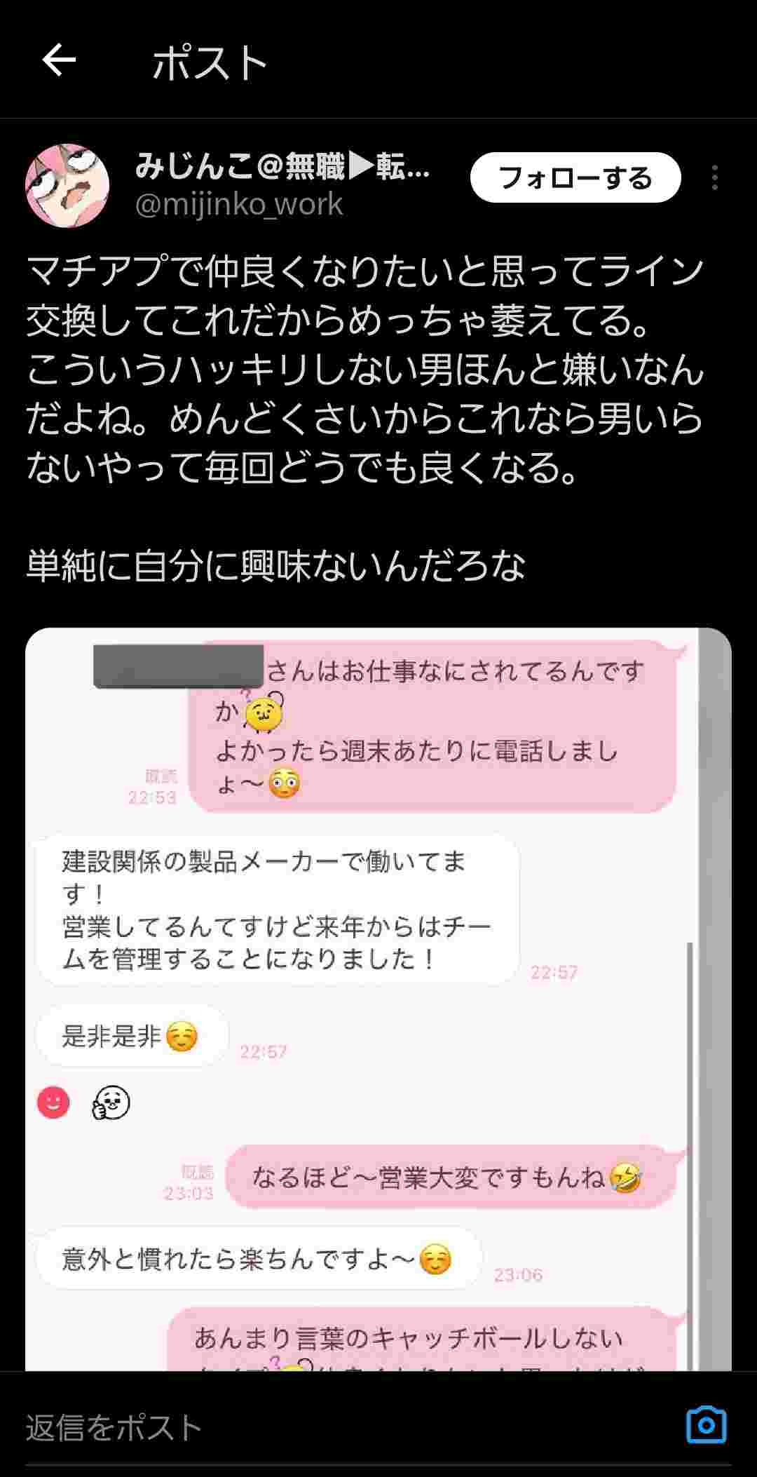 友達の紹介とかだったらもう少し辛抱強く話し続けようとするだろうけど所詮マチアプやしな