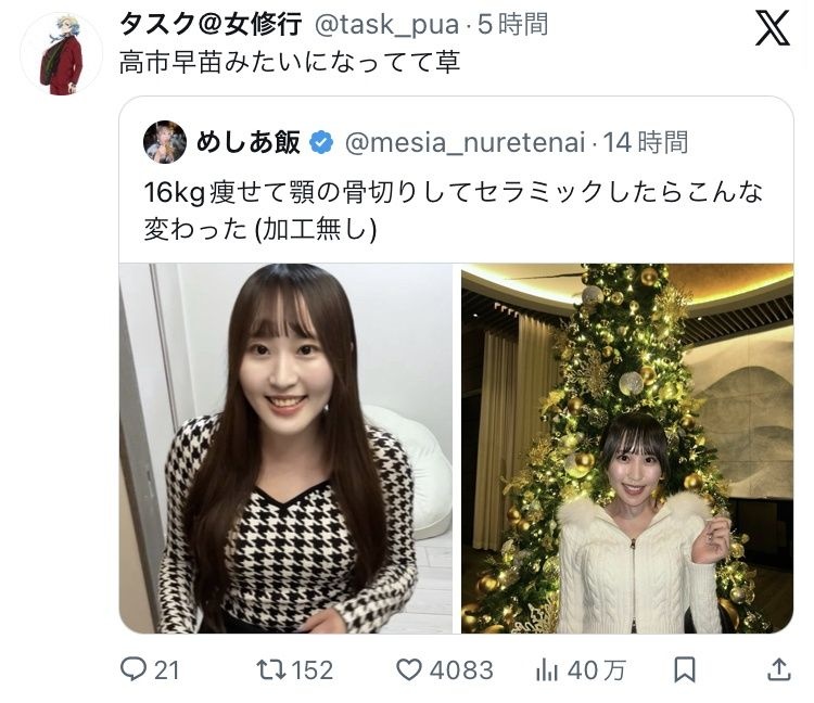 まんさん「16kg痩せて顎の骨切りしてセラミックしたらこんな変わった(加工無し)」→アンチ「高市早苗じゃん」