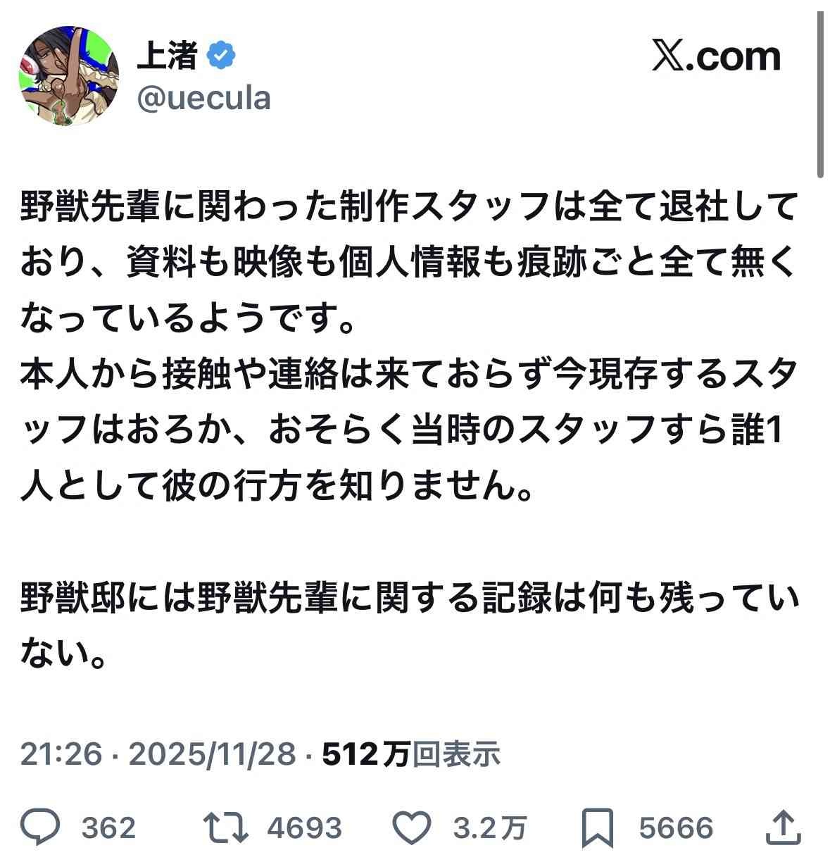 ホモビ監督「淫夢時代の社員は全員退社しており、野獣先輩の情報の一切は失われています」