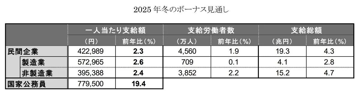 三菱UFJリサーチ&コンサルティングによる、「2025年冬の民間企業のボーナス見通し」は、前年比2.3%プラスで5 年連続の増加と予測しています。