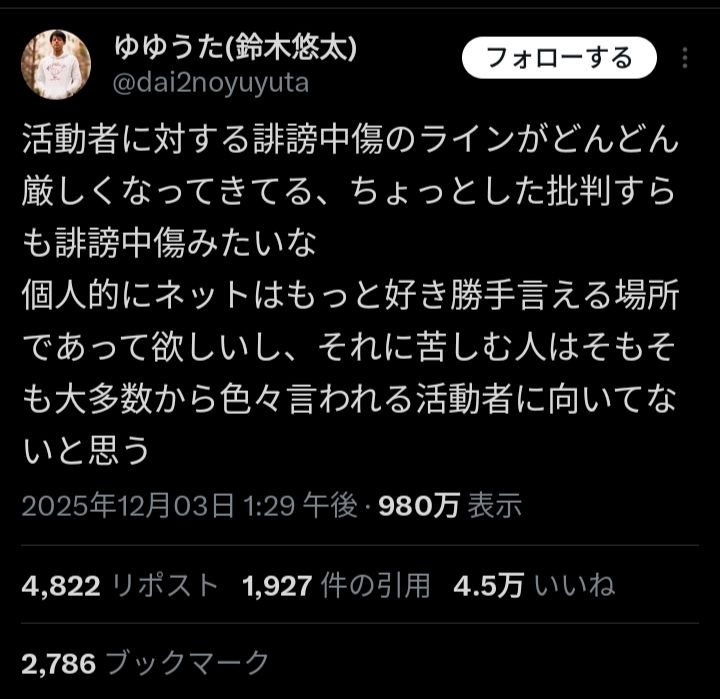 ゆゆうた、正論「ちょっと批判されただけで誹謗中傷だとか言い出す奴は活動者に向いてない」