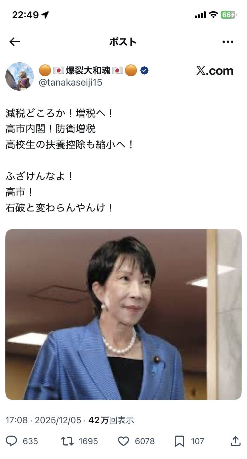 ましてや減税があるかもなんて - 46 名前:ここからは表現の自由でイカせていただきます 投稿日時:2025/12/06(土) 23:00:40.490 ID:PTaA4lemp