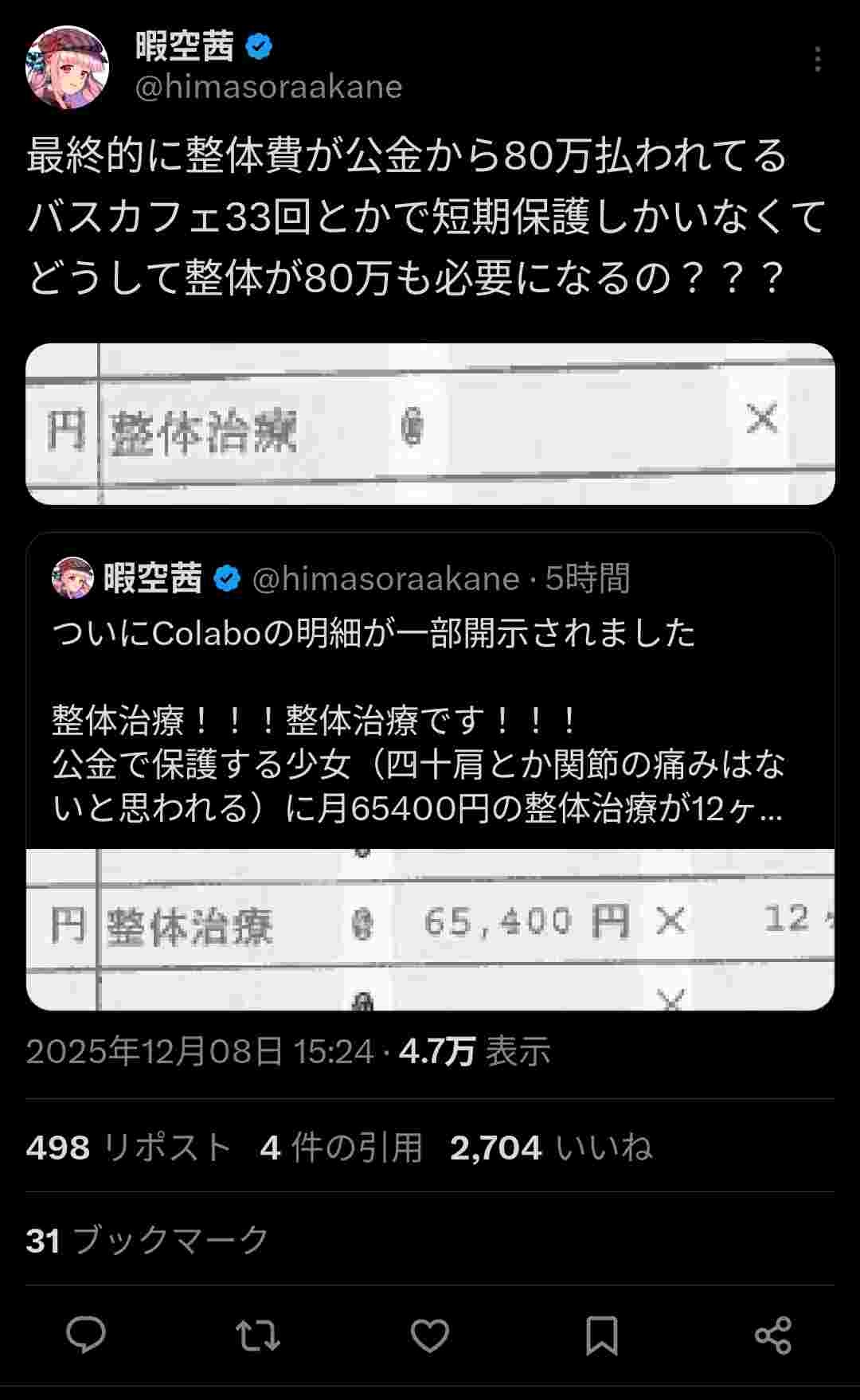 公金で保護する少女(四十肩とか関節の痛みはないと思われる)に月65400円の整体治療が12ヶ月です!!!なにこれ!?!?!?!?!?!?最終的に整体費が公金から80万払われてる