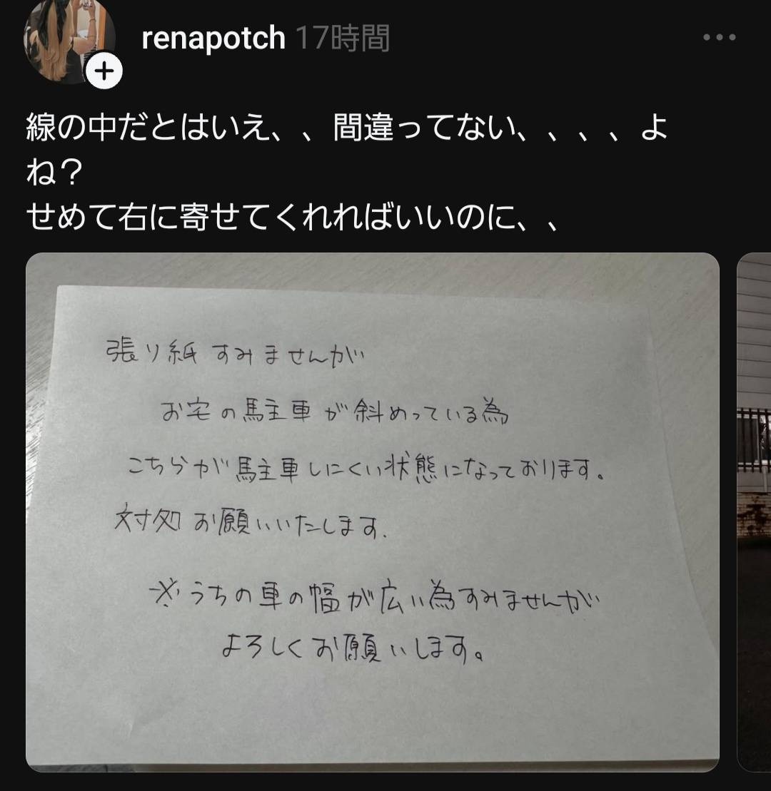 まんさん「こいつ駐車下手過ぎるから張り紙した。線の中とはいえ間違ってないよね?」