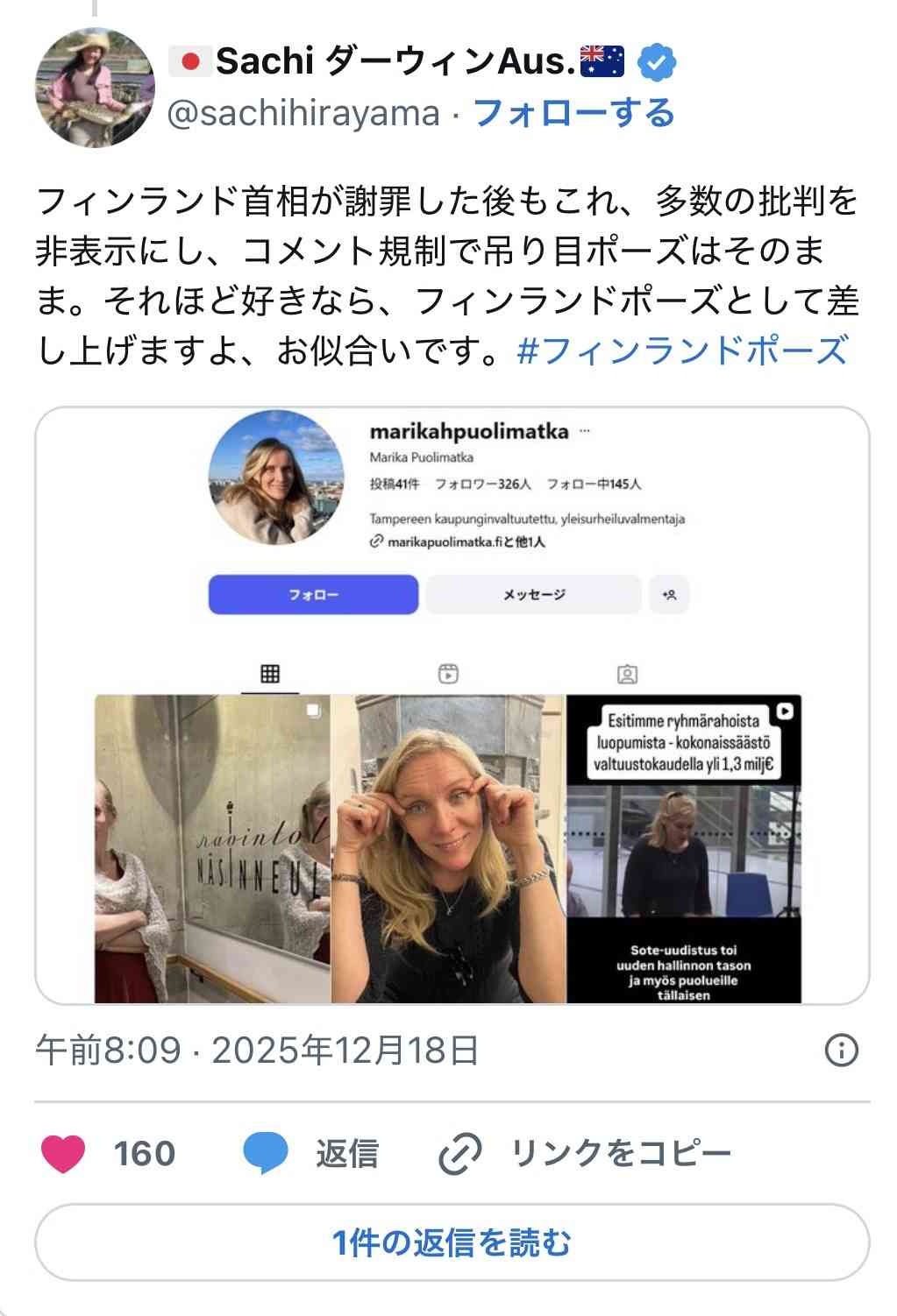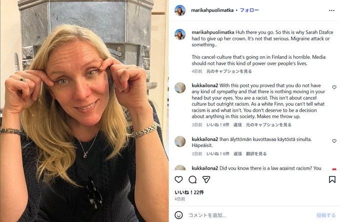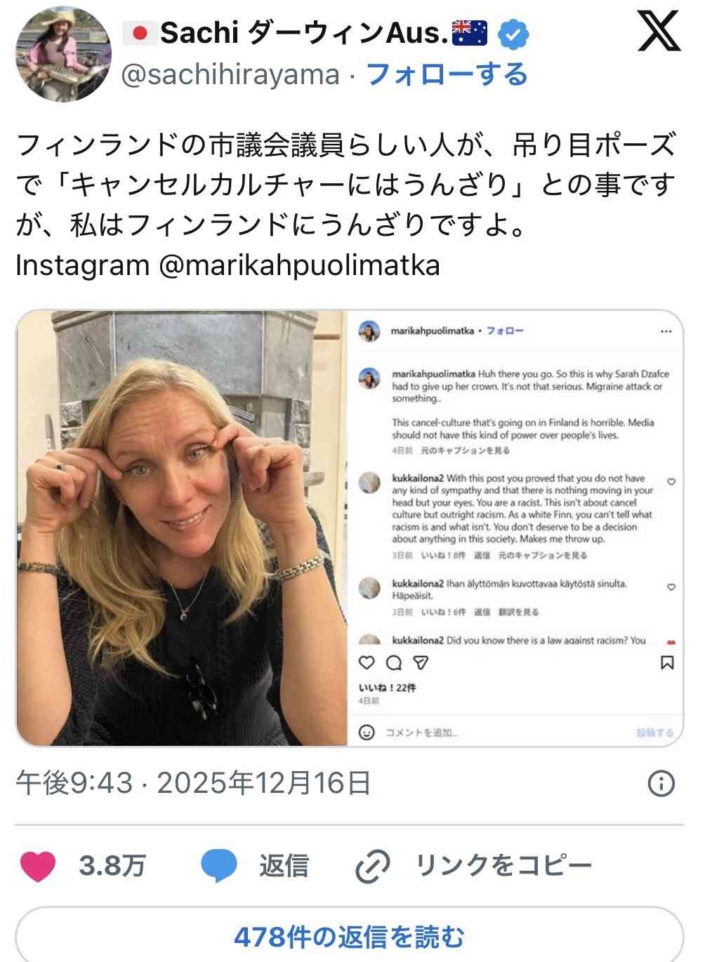 フィンランド女議員「吊り目ポーズやめろ?は~あ、もう『キャンセルカルチャー』はうんざり…w(吊り目ポーズでパシャッ」
