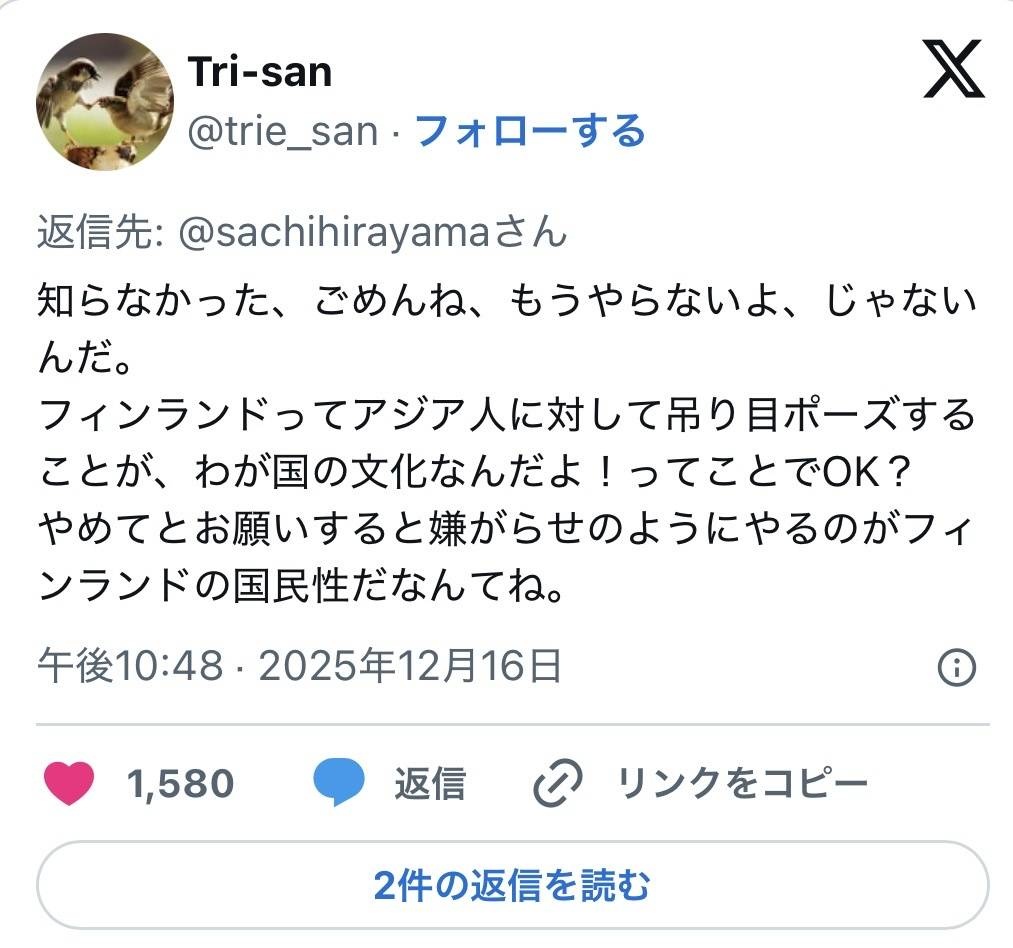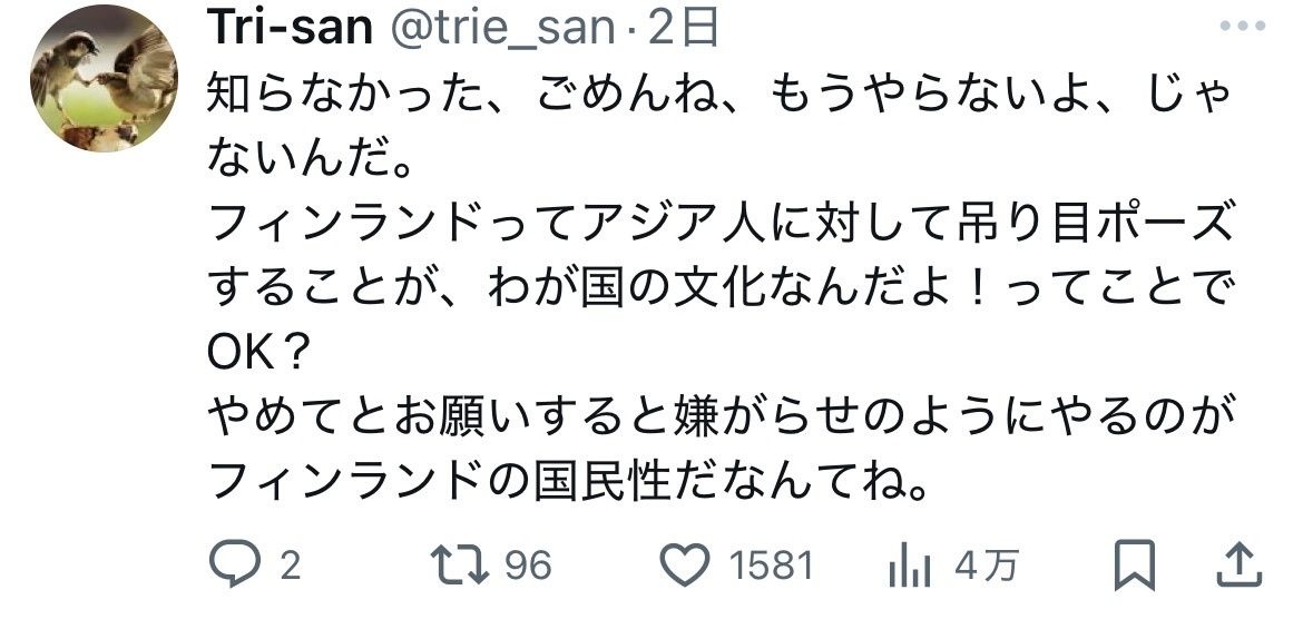 - フィンランドでは吊り目ポーズでアジア人を馬鹿にするのが『カルチャー』らしい