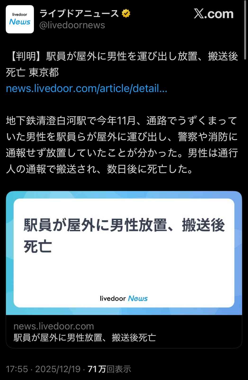 駅員「男性が倒れてる…一旦外に運び出してと」→誰も警察や消防に通報せず男性死亡