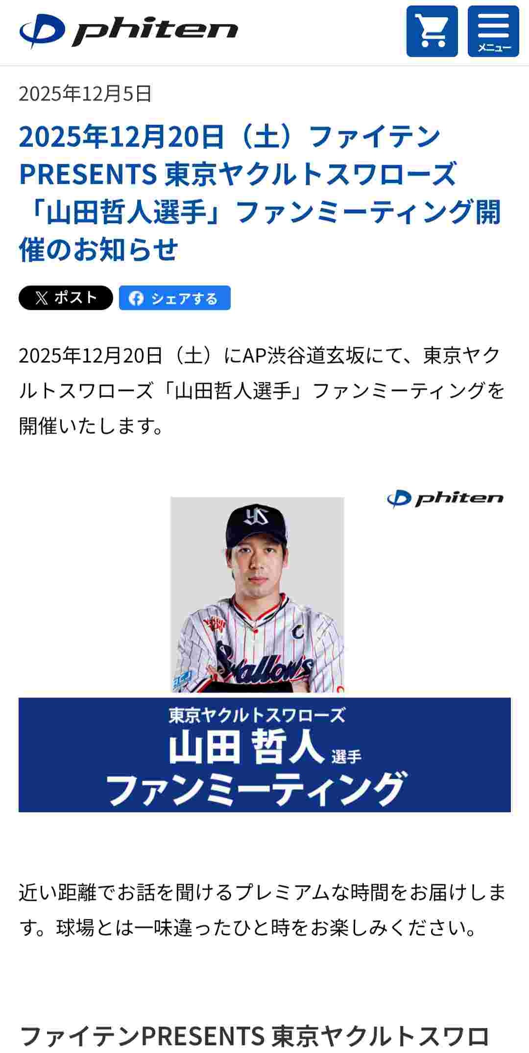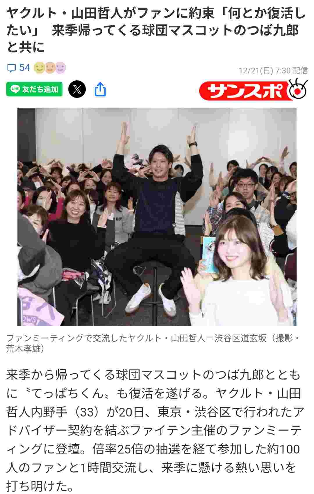 - ファンからの質問コーナーでは、背番号1が書くサインの「人」の字が「八」に見えることから、山田を「てっ〝ぱち〟くん」と呼ぶつば九郎の他に「てっぱちくんと呼ぶ人がいるか?」との問いに「いないですかね」と回答した山田。来季はつば九郎との唯一無二のコンビで神宮を盛り上げる。(武田千怜)