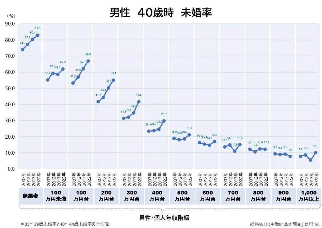 40歳なら普通は1000万超えるから未婚率1割やんけ