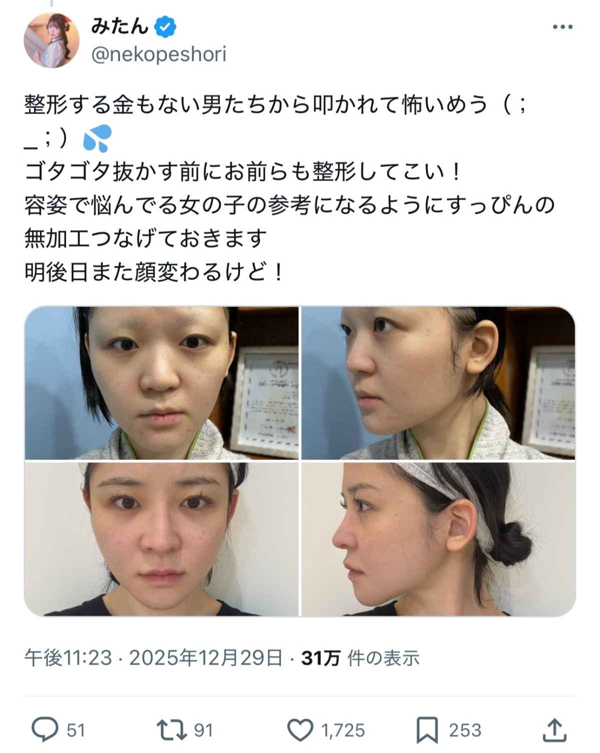 - まぁ元々本当に顔面偏差値40とかで生きづらさ感じてたならどんどん整形してええと思うわ