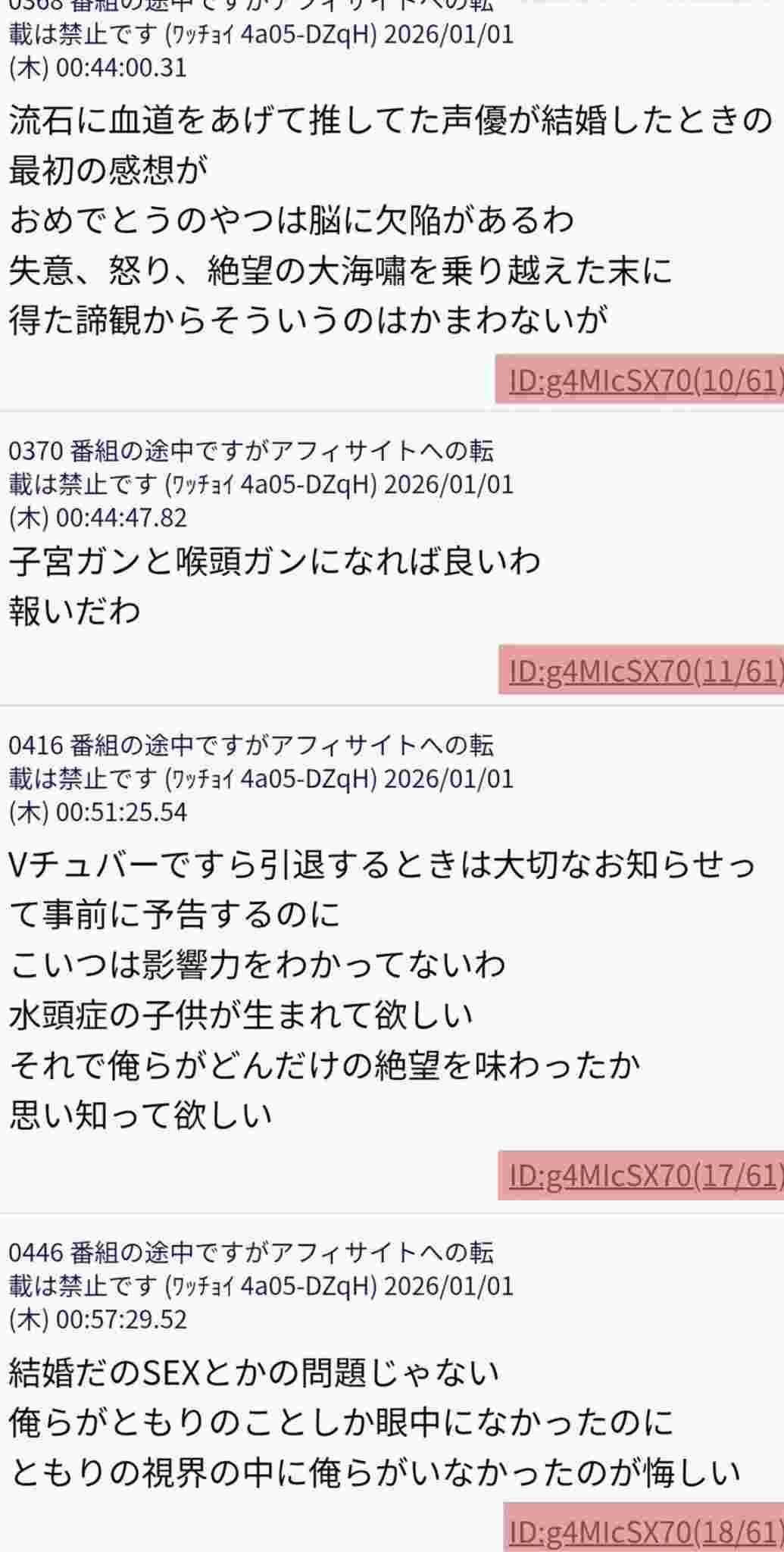大好きな声優結婚して大発狂してて草 - 15 名前:ここからは表現の自由でイカせていただきます 投稿日時:2026/01/02(金) 10:07:35.934 ID:YY1Q0U0mA