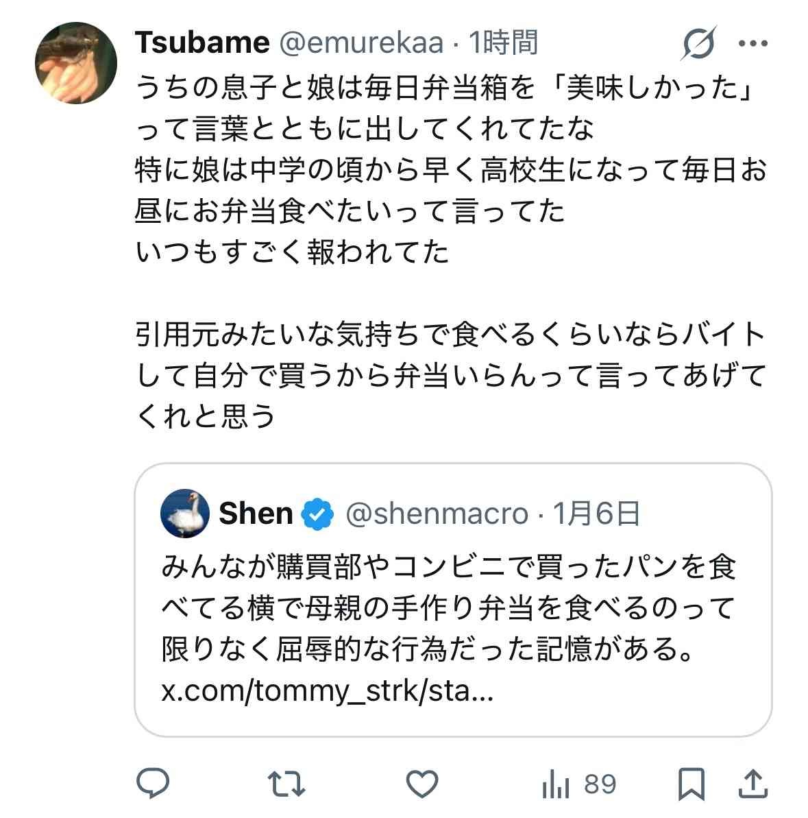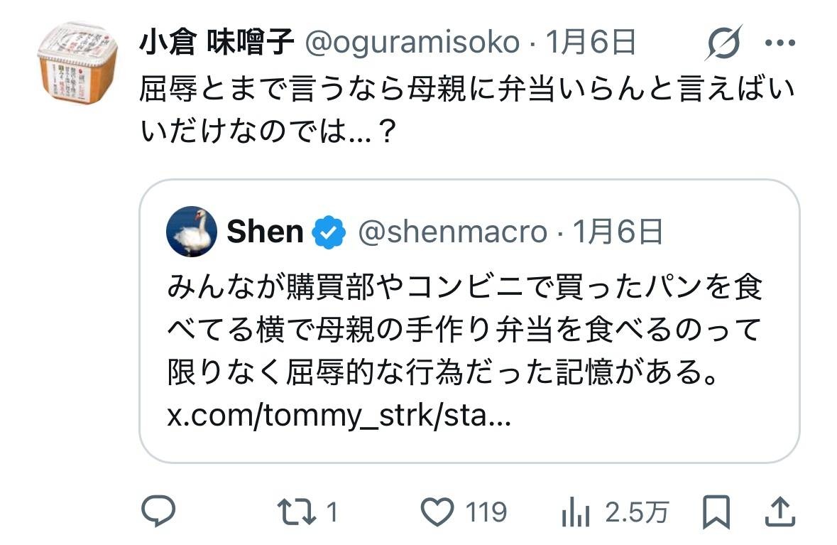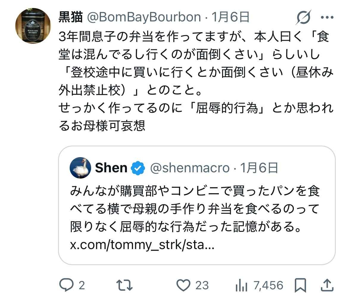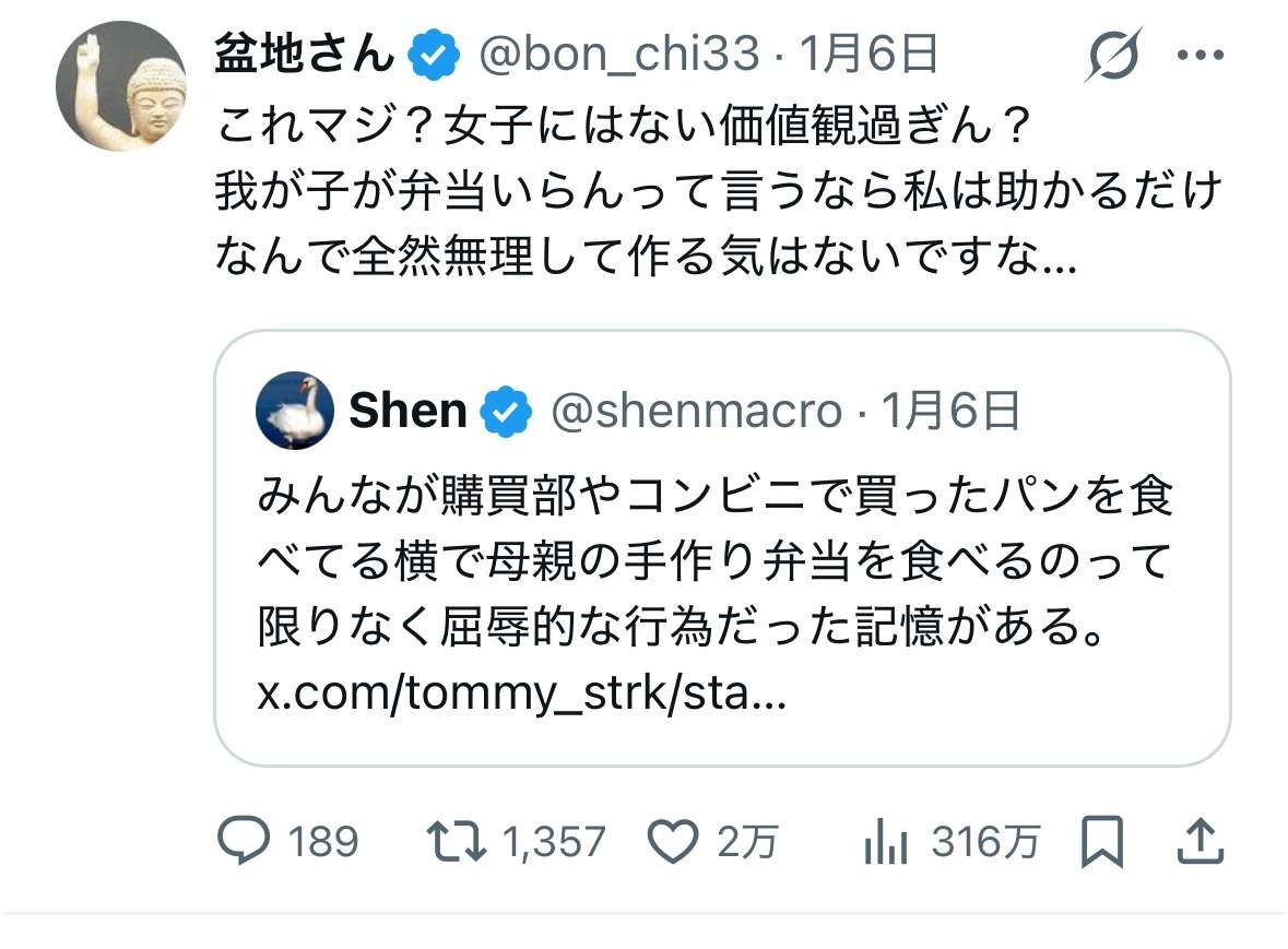 X民「みんながコンビニとかで買ったパン食ってる横で母親の手作り弁当食うのは屈辱的だった」→母親の女さんブチギレ