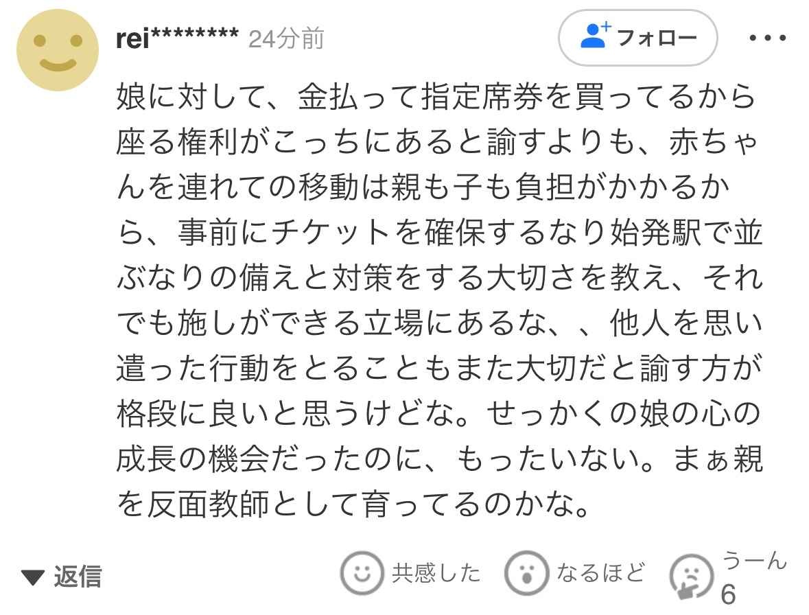 「カチンときましたね。もちろん赤ちゃんを連れた移動は苦労も多いことでしょう。私も子どもを育てた経験がありますから、理解できます。でもそれなら、ご自身で指定席を取るなり、並んででも自由席に席を確保すべきでしょう」