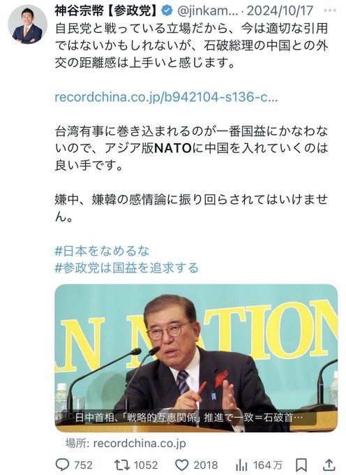 - 参政党・神谷宗幣「今は自民党と戦う立場だから適切じゃないかもしれないが、あえて言う『石破政権の対中外交の距離感』は上手い」