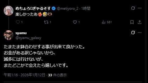 せっかくやからSPオプションつけてsyamuさんと穴兄弟になってこい - 47 名前:ここからは表現の自由でイカせていただきます 投稿日時:2026/01/13(火) 22:35:43.304 ID:6yelGzePD