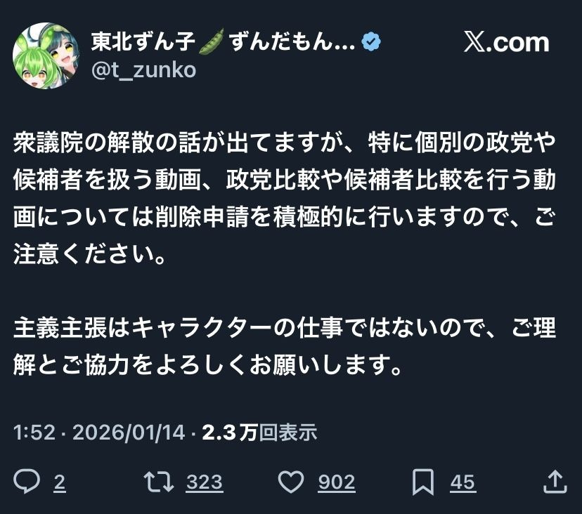 ずんだもん公式「衆議院解散の話が出ていますがそういう動画は消します。主義主張はキャラクターの仕事ではありません」
