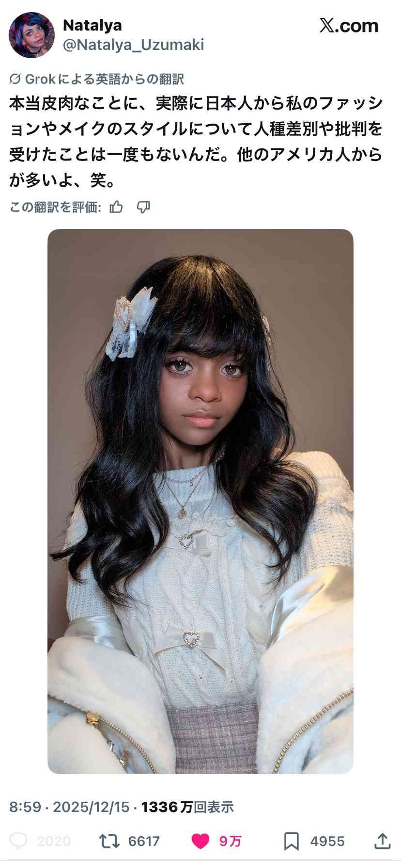 黒人の女の子「日本のファッションをしたら日本人からは批判されないのに、アメリカ人にめちゃくちゃ批判される!」→90万いいね