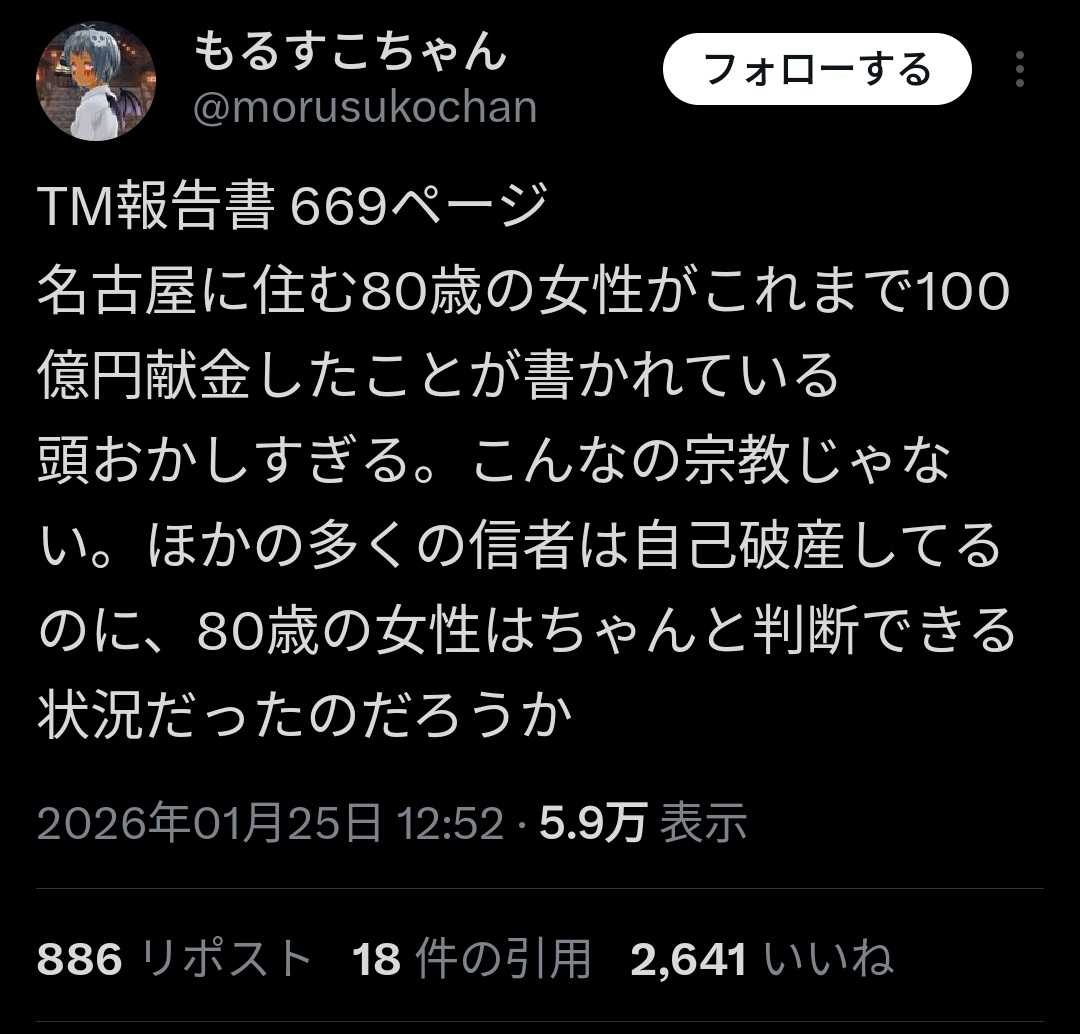 100億も寄付してたら税金対策とかいうレベルじゃないやろ - 30 名前:ここからは表現の自由でイカせていただきます 投稿日時:2026/01/25(日) 17:22:58.544 ID:sPs331/nn