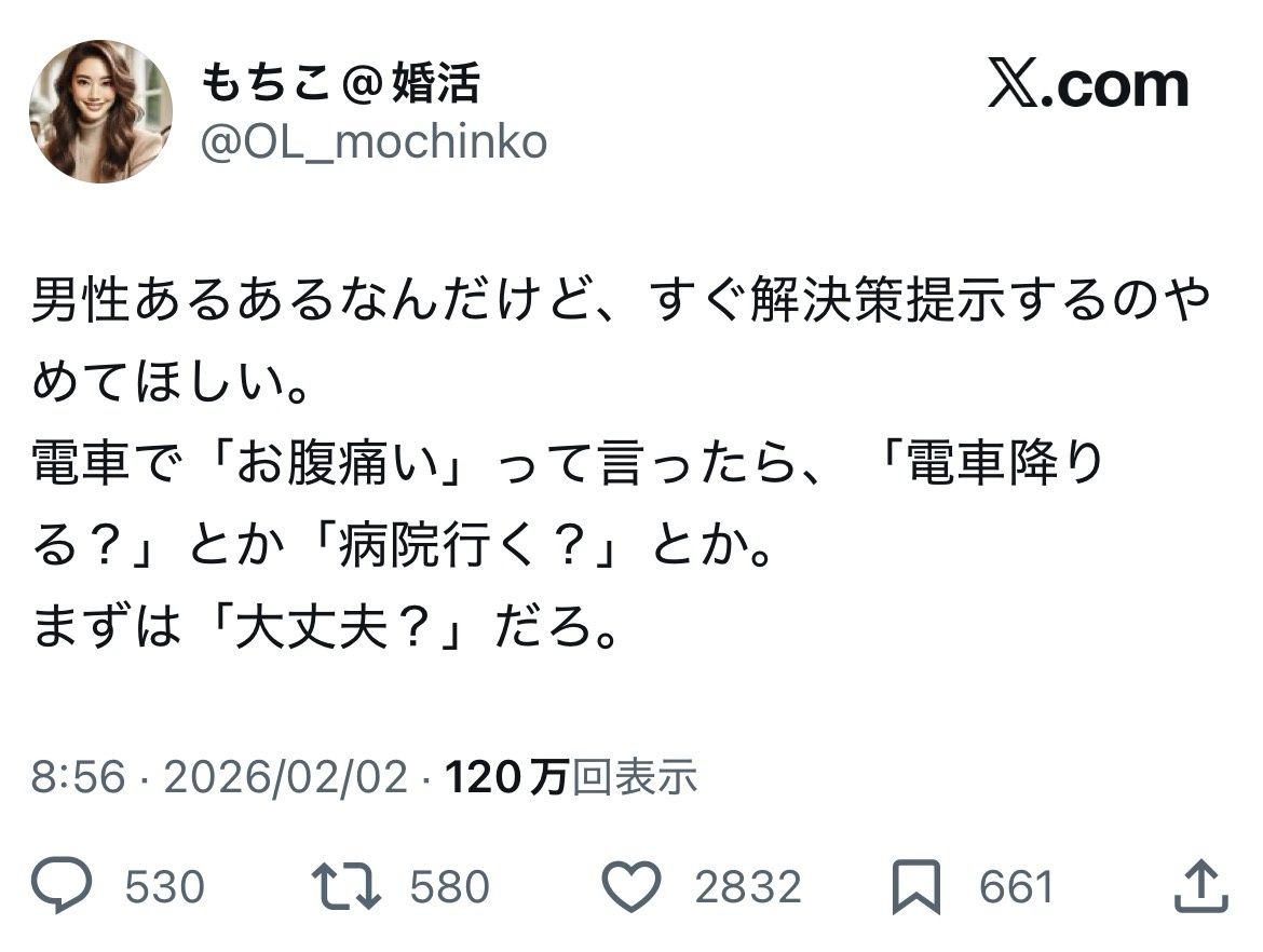 これ叩かれまくってるんやけどそんなおかしいこと言ってないと思うんやがエッヂでもワイだけなんか?お腹痛い→正露丸飲む?とかよりお腹痛い→大丈夫?正露丸とか薬あるよ~って言える方がうまくいくやろ - 42 名前:ここからは表現の自由でイカせていただきます 投稿日時:2026/02/03(火) 08:44:45.711 ID:qTtpOYXst