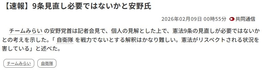 チームみらい・安野「憲法9条改正は必要だよね😅リスペクトしようよリスペクト😅」