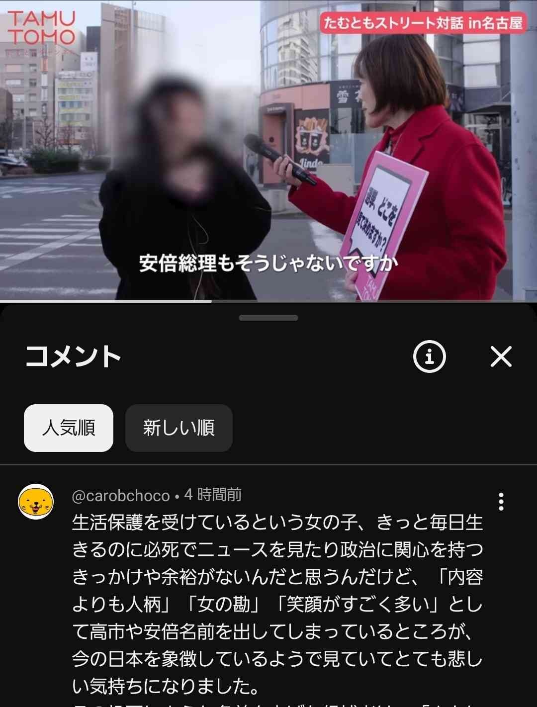 「直感で高市さん、笑顔がいいから」という女性。政治への要望を聞いたら、生活保護から自立するために貯金をもう少し認めてほしい、と。