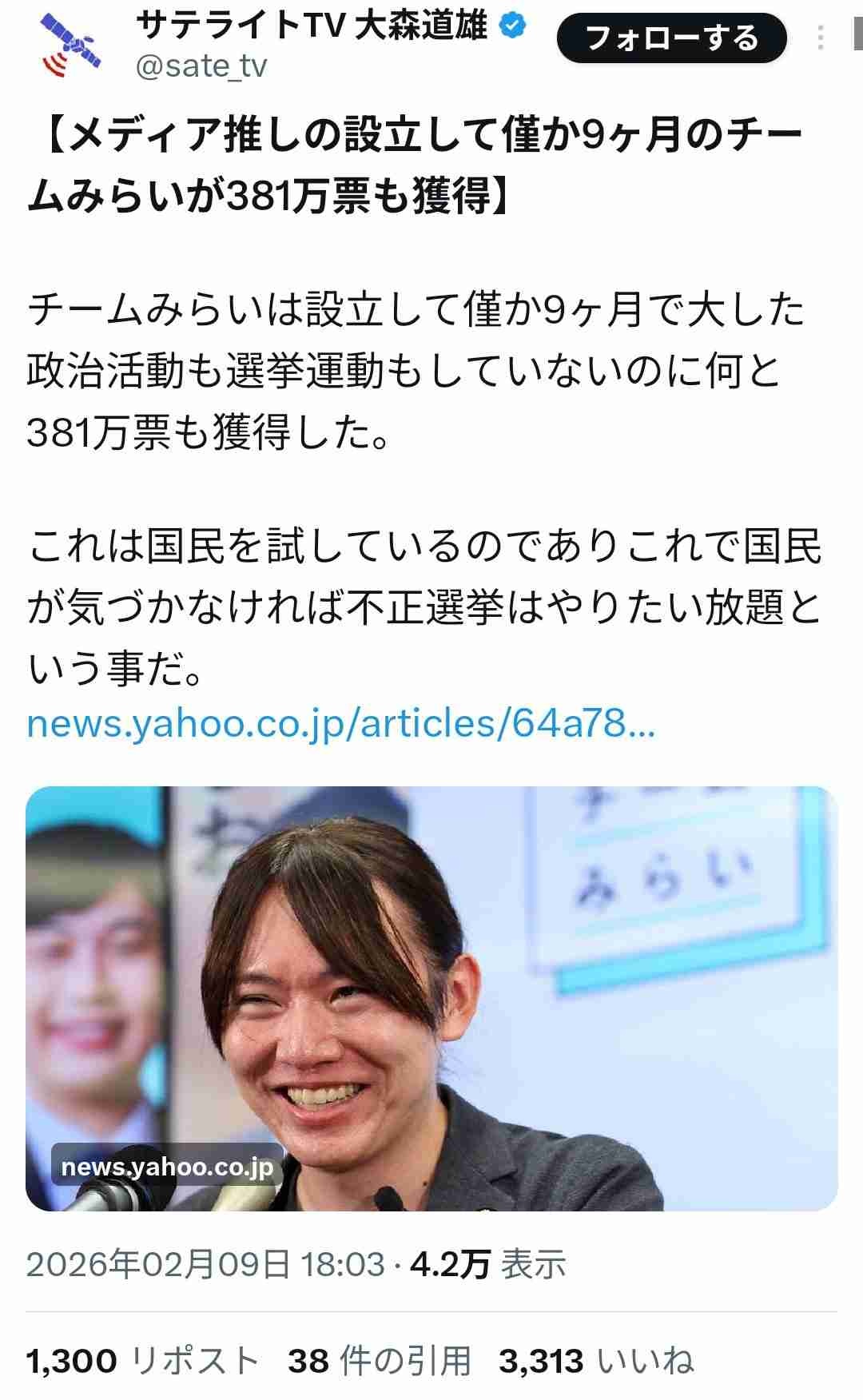 - なんかチームみらいがここまで伸びたのはおかしい、不正選挙だ!票を数え直せ!と発狂してる