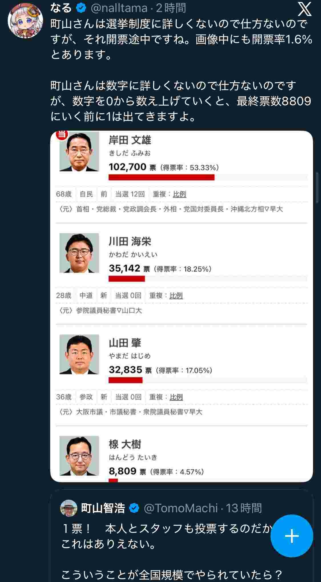 - でも露出少ないのに得票率高いのは上級でみらい推す何らかのグループあるんやと思うがな