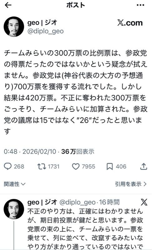 れいわ支持者、参政党支持者、保守党支持者が自分たちの議席が伸びなかったのはみらいに票を盗まれたからだと言ってるぽい - 39 名前:ここからは表現の自由でイカせていただきます 投稿日時:2026/02/10(火) 19:54:02.332 ID:vnE33aQ0i