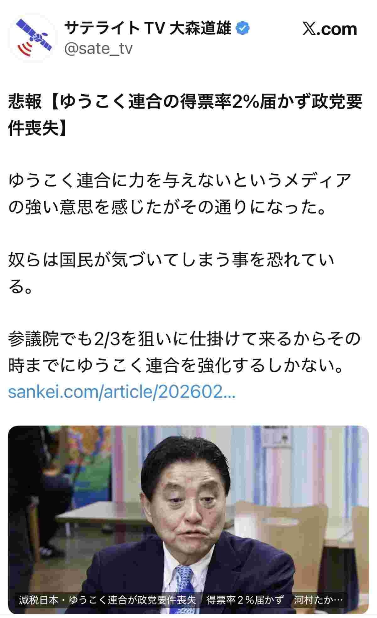 ゆうこく連合支持者も仲間に入れてくれ - 43 名前:ここからは表現の自由でイカせていただきます 投稿日時:2026/02/10(火) 19:54:41.176 ID:Ta88hhqhz