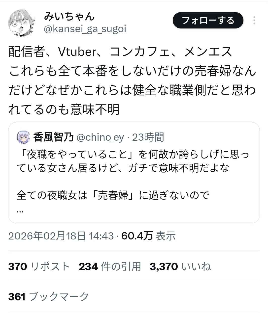 みいちゃん「Vチューバーはセクロスをチラつかせて視聴者から金を騙し取ってる売春婦」