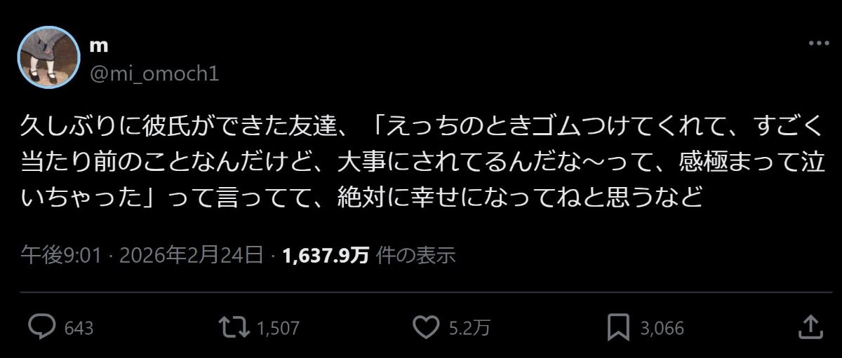 まんさん「彼氏がコンドームつけてくれた!感極まって泣いちゃった💦」