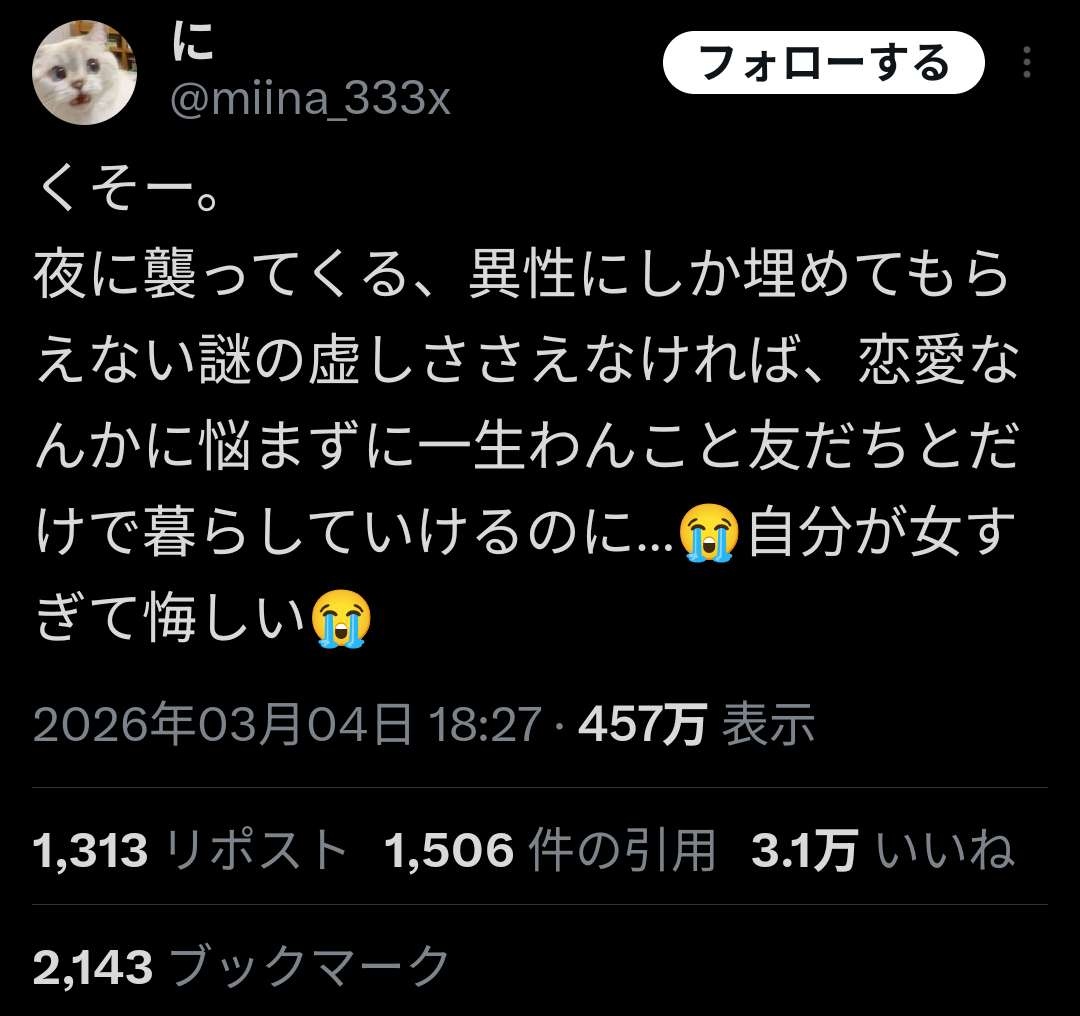 女は性欲とか本当に一時的でしかないからそれで発散されたらもうおしまいやと思ってるけど - 58 名前:ここからは表現の自由でイカせていただきます 投稿日時:2026/03/06(金) 11:19:16.651 ID:mh1ZHxE81