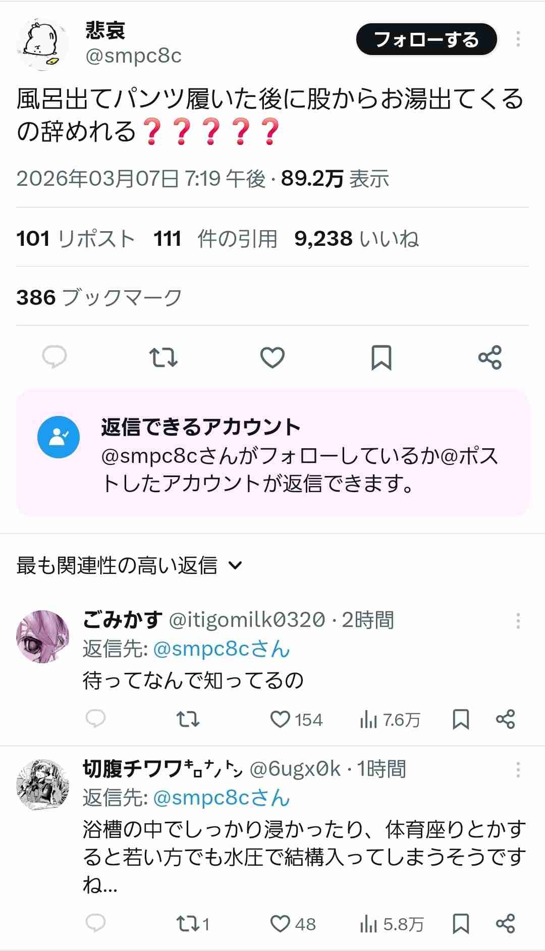 まんさん「風呂出てパンツ履いた後に股からお湯出てくるの辞めれる?」1万いいね
