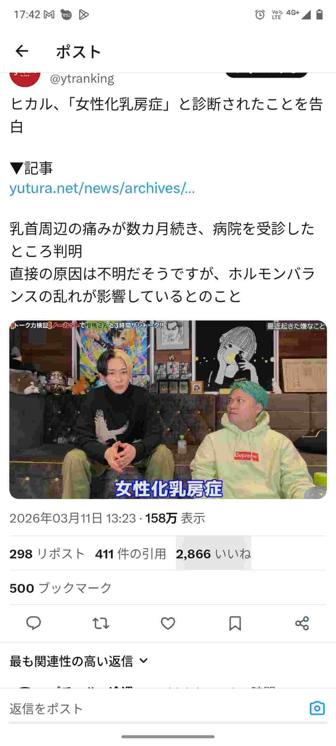 ヒカル 鬱の次は女性乳房化症になるwww