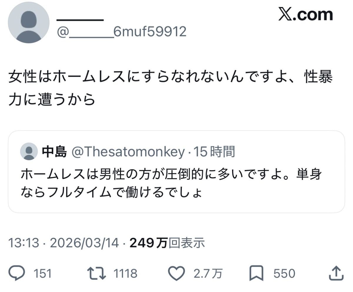 お前ら女どもがちゃんとホームレスを見てないだけやろ - 19 名前:ここからは表現の自由でイカせていただきます 投稿日時:2026/03/15(日) 01:32:46.152 ID:9205yAmkW
