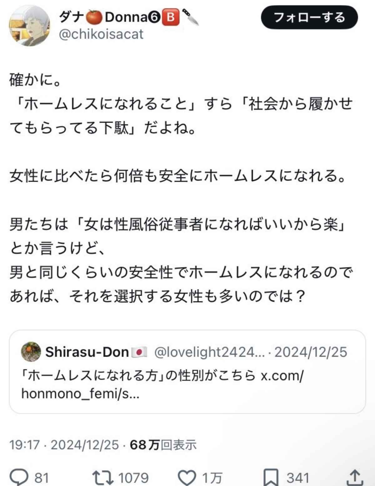 - なんか前に男はプライド高いから助けを拒んで女は素直に助けを受けるから女のホームレスは少ないって記事見た気がする