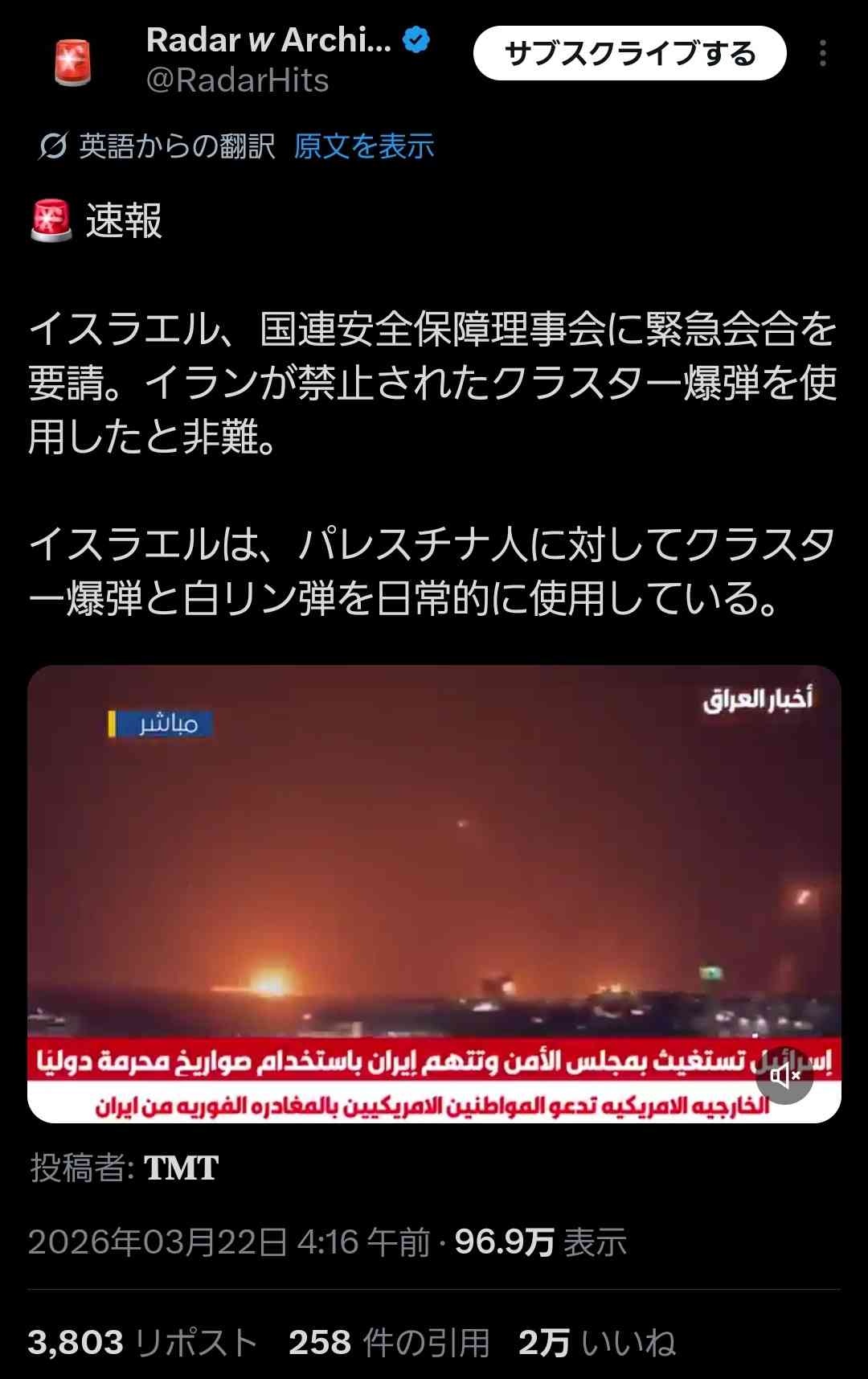 - イスラエル、国連安全保障理事会に緊急会合を要請。イランが禁止されたクラスター爆弾を使用したと非難。