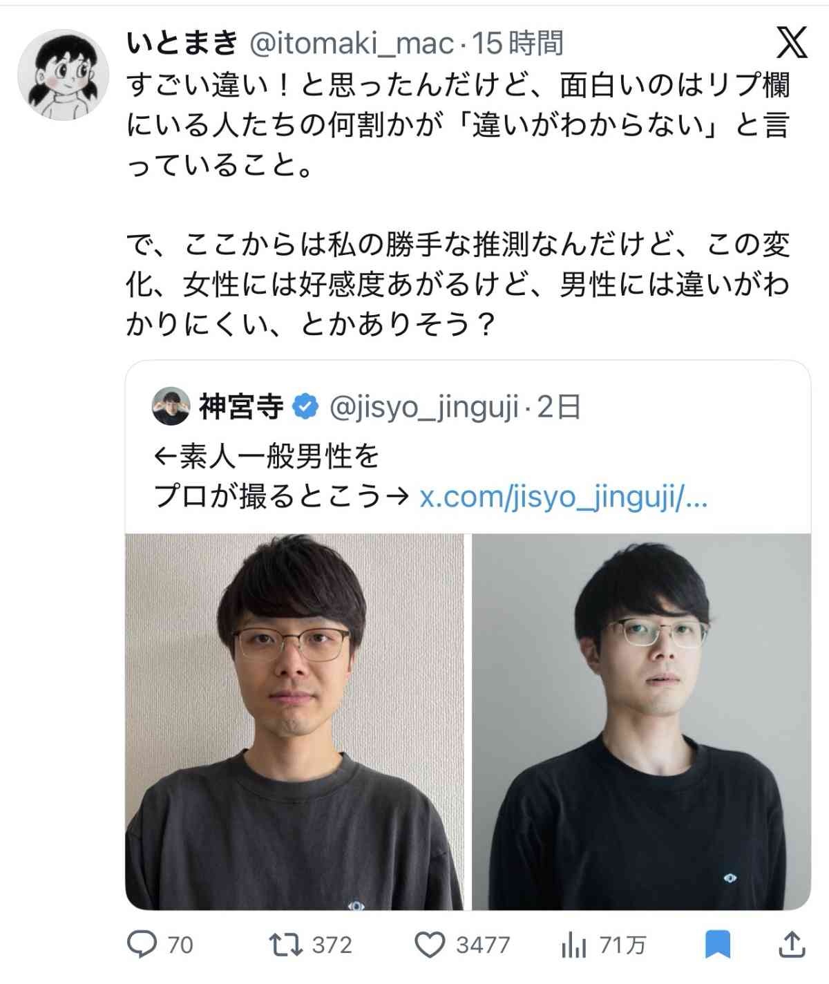 ポーズとか光の当て方とか背景ぼかしとかカメラの設定でここまで変わるって趣旨やと思ったけど