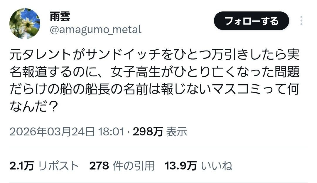 XとYouTubeとヤフコメと5chではもう実名出てるで - 10 名前:ここからは表現の自由でイカせていただきます 投稿日時:2026/03/26(木) 06:38:45.077 ID:s9AUtDsv1