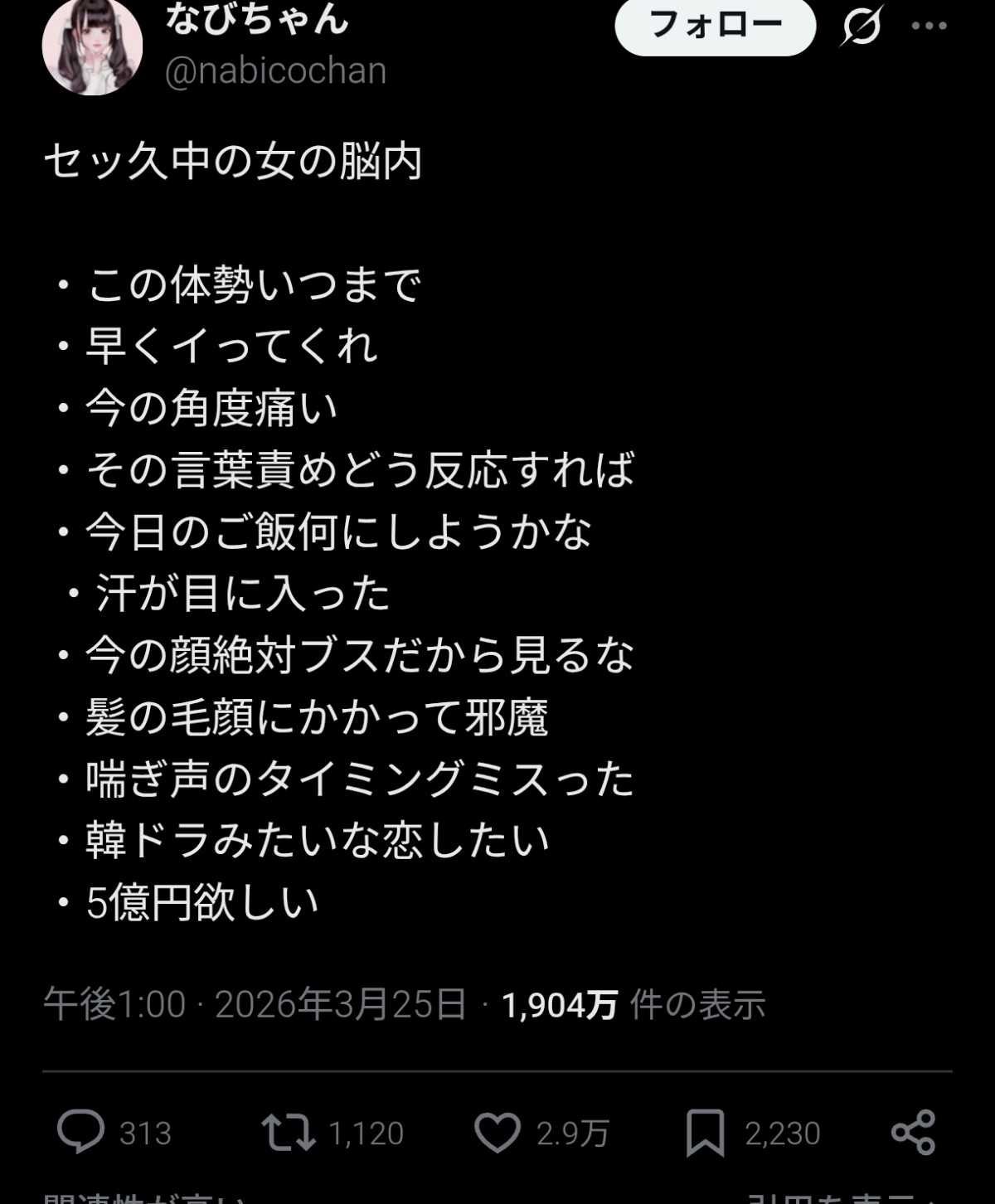 男も色々我慢しとんのや - 19 名前:ここからは表現の自由でイカせていただきます 投稿日時:2026/03/28(土) 07:09:30.008 ID:QHdTW8KgG