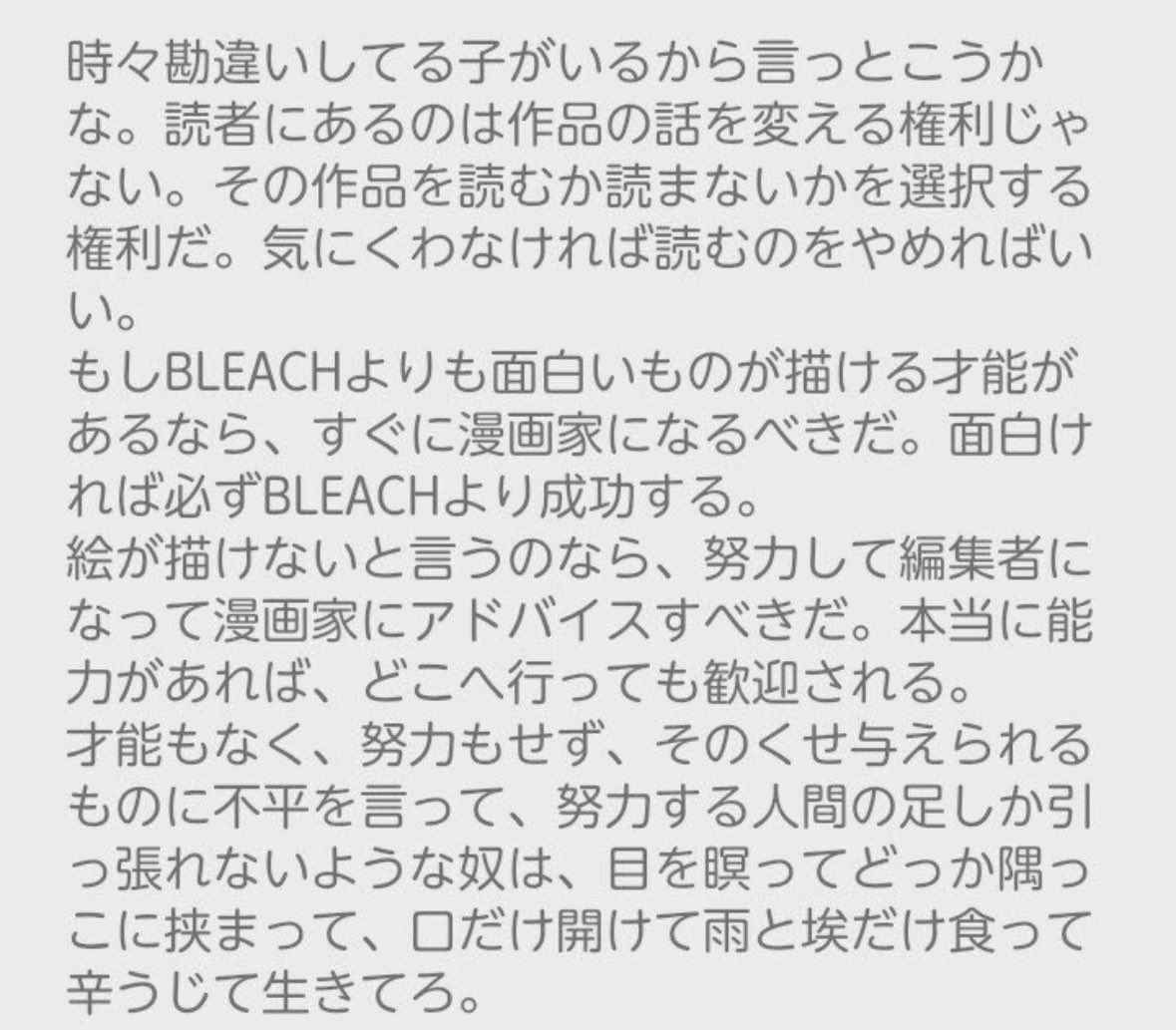 もしBLEACHよりも面白いものが描ける才能があるなら、すぐに漫画家になるべきだ。面白ければ必ずBLEACHより成功する。