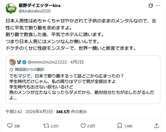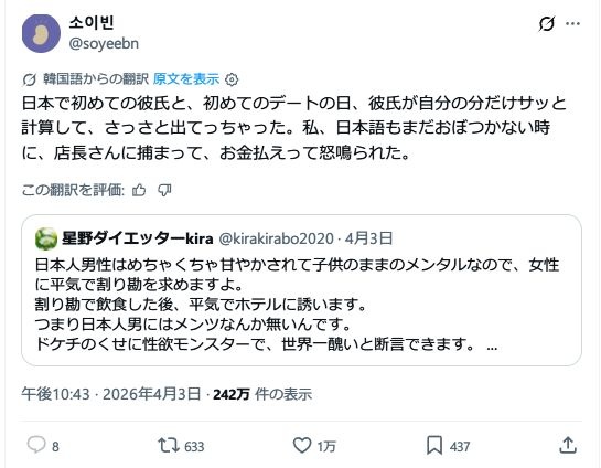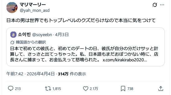まんさん「日本人男性はめちゃくちゃ甘やかされて子供のままのメンタルなので、女性に平気で割り勘を求めますよ。」2.8万いいね