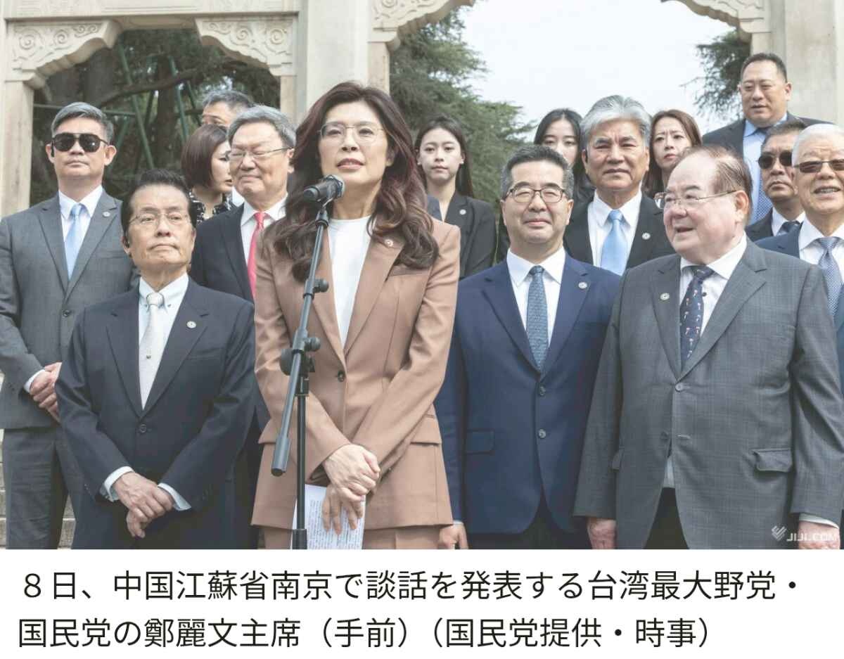 - 【台北時事】中国を訪問している台湾最大野党・国民党の鄭麗文主席(党首)は8日、江蘇省南京で同党創設者、孫文が眠る「中山陵」を墓参し、談話を発表した。鄭氏は「われわれは共に尽力して両岸(中台)の和解や団結を促し、地域の繁栄や平和をつくり出すべきだ」と訴えた。