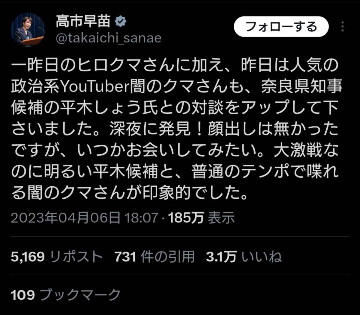 一昨日のヒロクマさんに加え、昨日は人気の政治系YouTuber闇のクマさんも、奈良県知事候補の平木しょう氏との対談をアップして下さいました。深夜に発見!顔出しは無かったですが、いつかお会いしてみたい。大激戦なのに明るい平木候補と、普通のテンポで喋れる闇のクマさんが印象的でした。