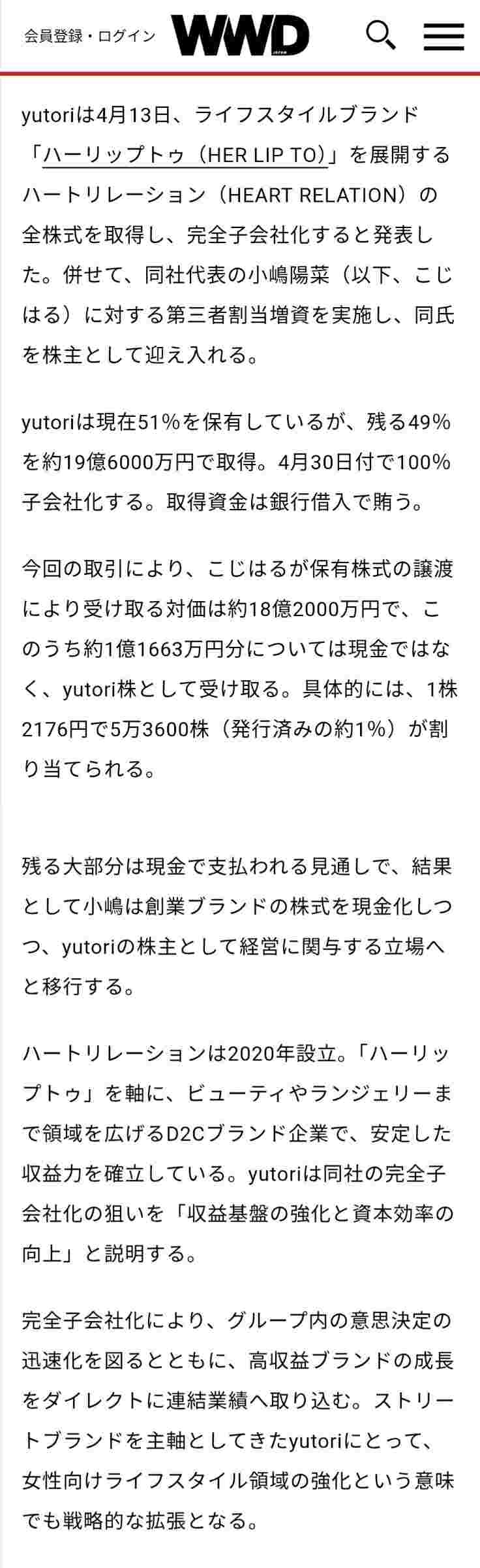 - 小嶋陽菜、ブランド運営会社を“全株売却”…上場企業と巨額ディール発表 個人の譲渡額「18.2億円」