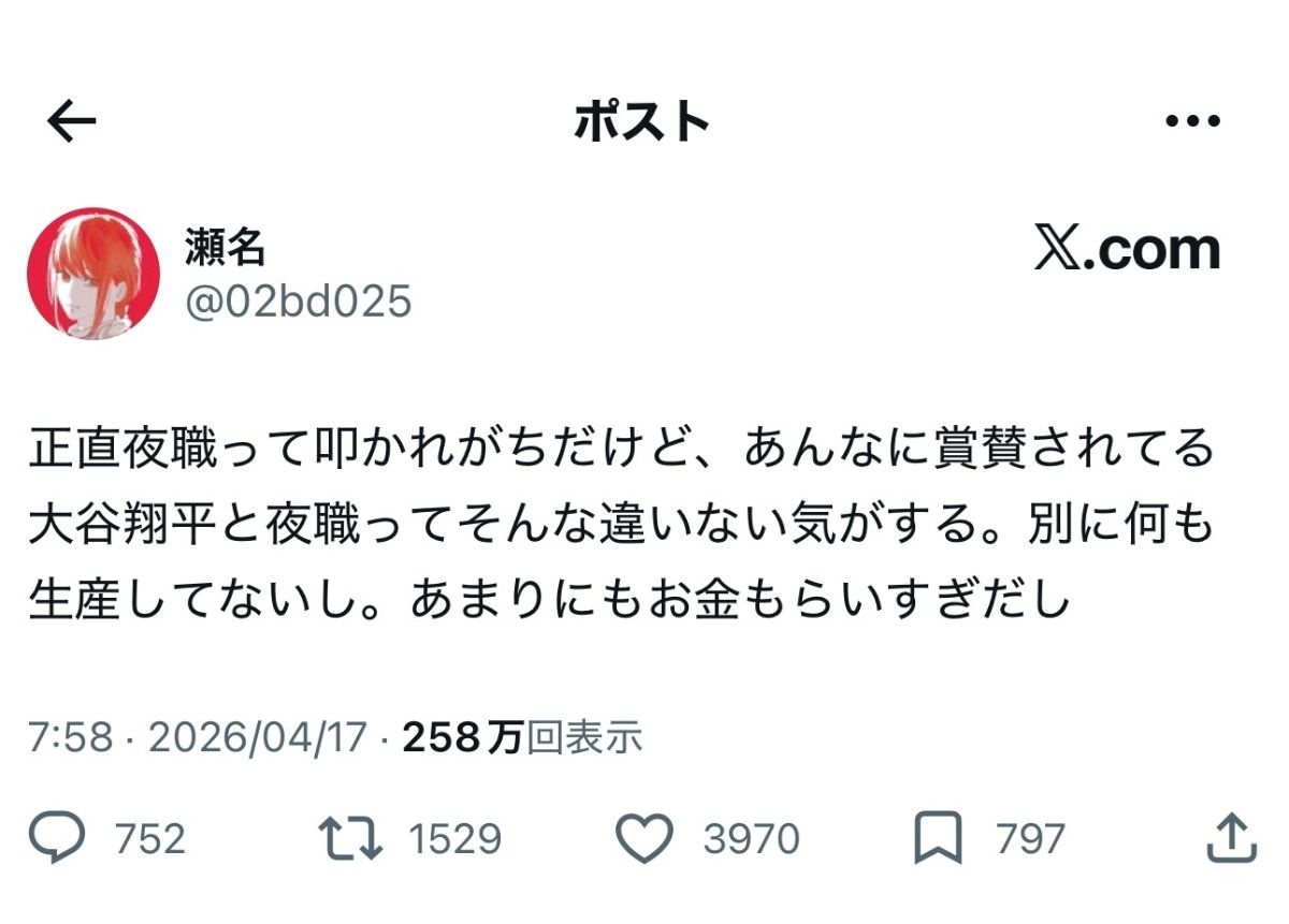大谷ってワード出せばインプ稼げるんだから夜職より楽よね