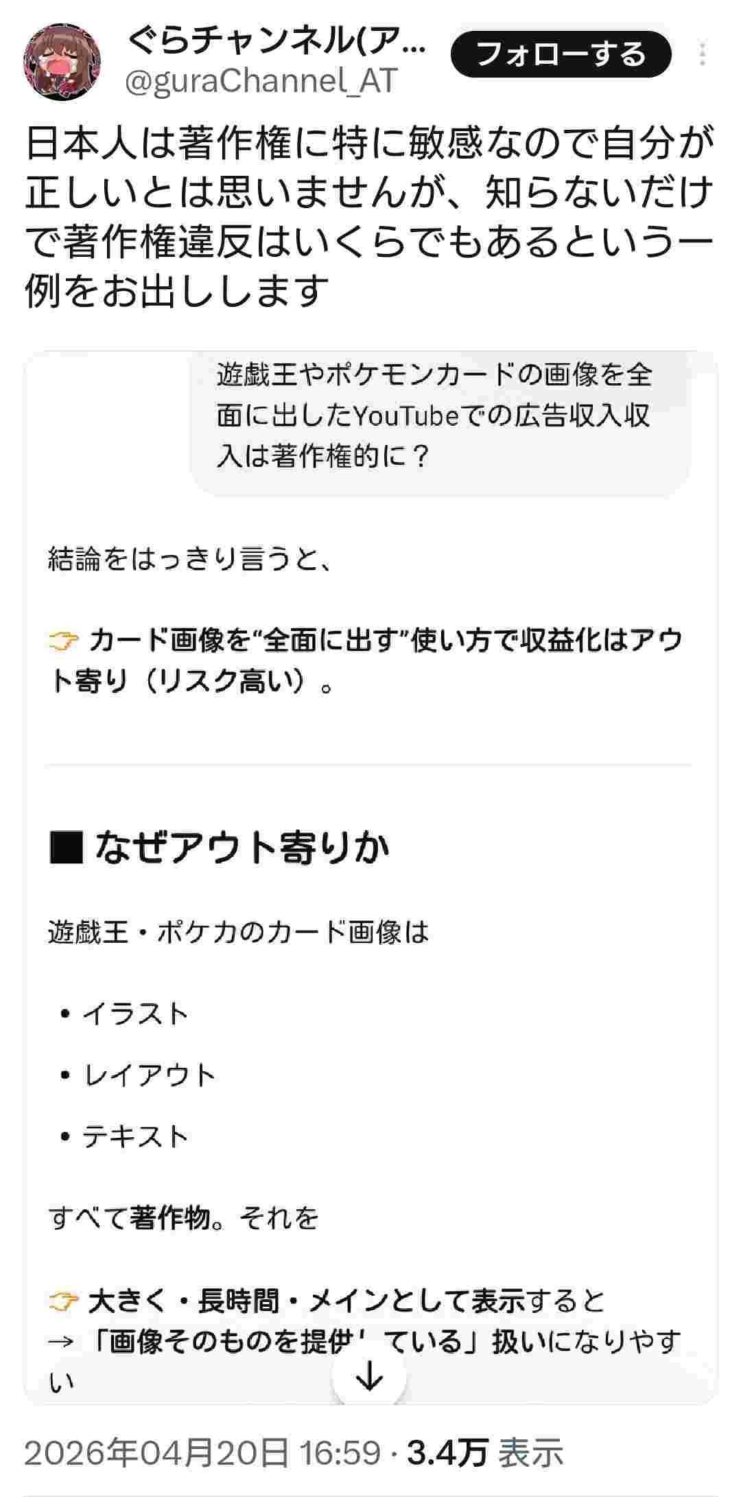普段から著作権違反しまくってるジャップが著作権違反で他人を叩くの滑稽よな - 18 名前:ここからは表現の自由でイカせていただきます 投稿日時:2026/04/21(火) 09:38:02.919 ID:wm7eYDO3V
